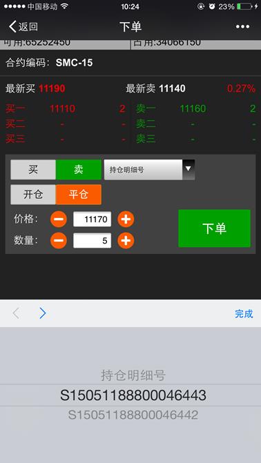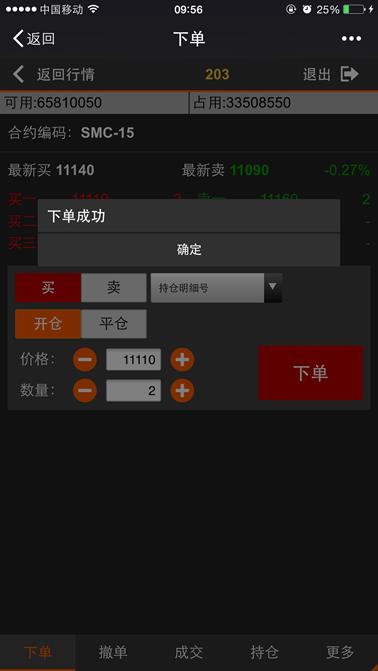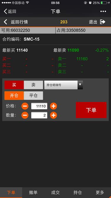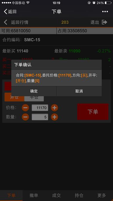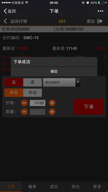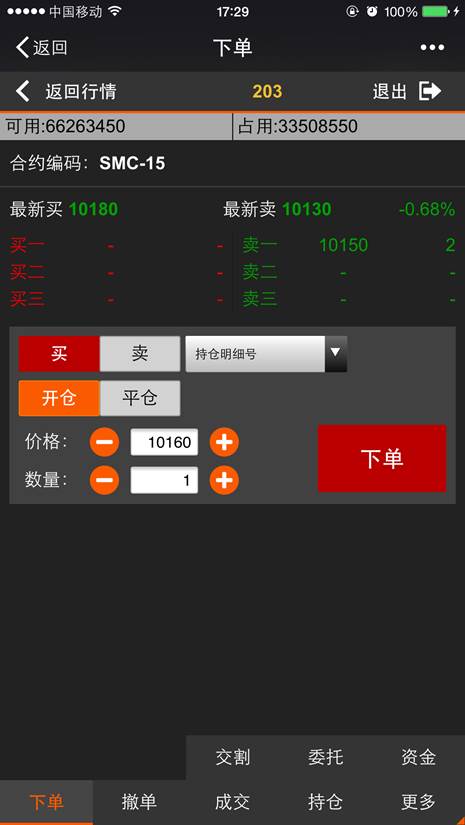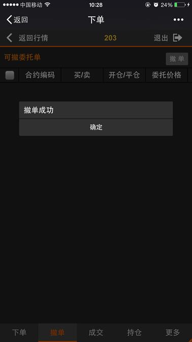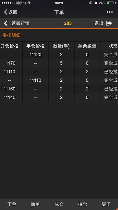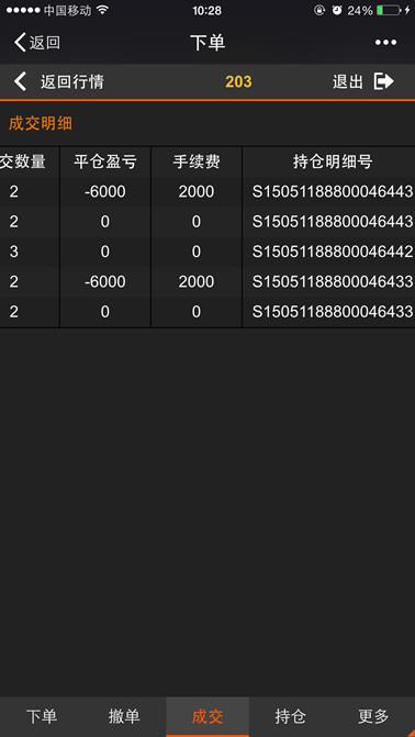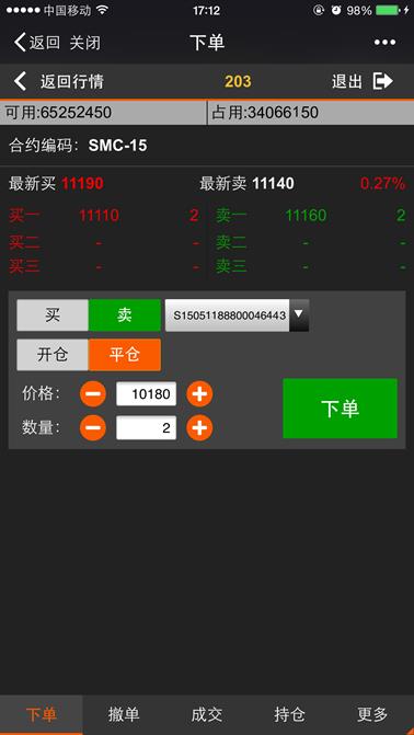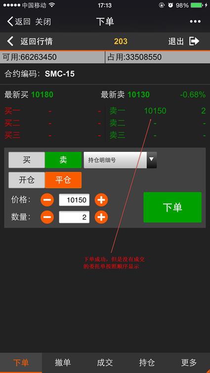 下单是利用微信平台进行开仓、平仓的交易的功能,点击【返回行情】按钮则返回到行情列表,点击【退出】则退出登录。