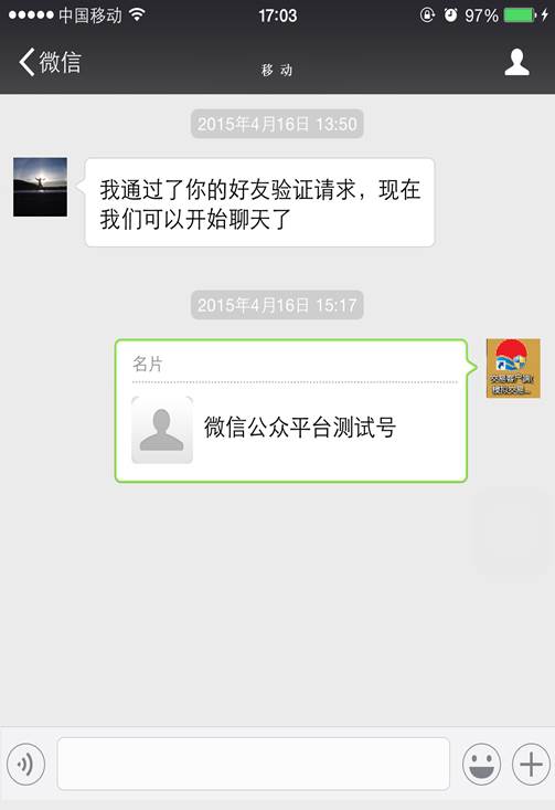 打开微信,发送微信公众平台号给客户,下图所示,点击进入微信公众号。
