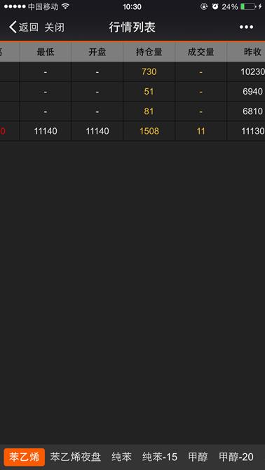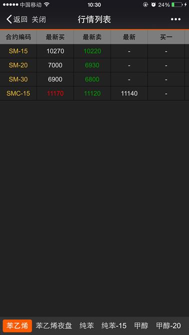 下图所示,在页面的底部显示的是新阳电子交易中心的商品,选择“商品”后行情列表内显示属于该商品的合约行情信息,页面支持左右、上下移动来查看行情信息。