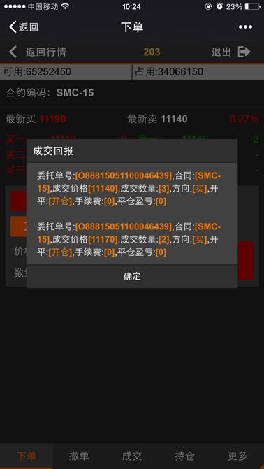 如果委托单成交了则系统返回成交提醒确认弹出框,下图所示。