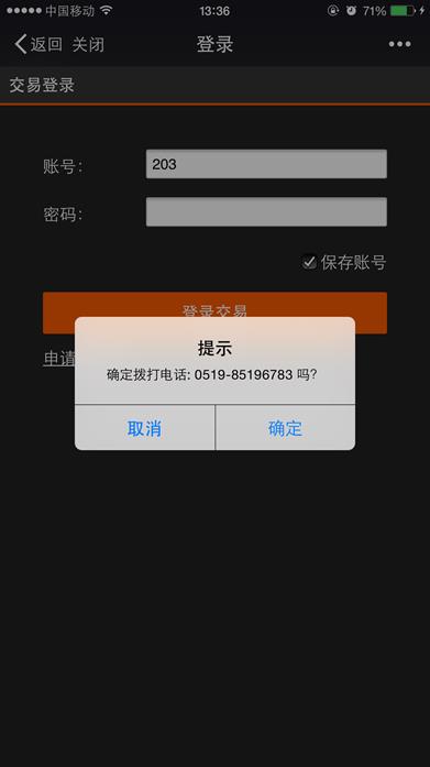 点击【申请开户】链接,显示新阳电子交易中心电话,可直接拨打电话,或者取消。