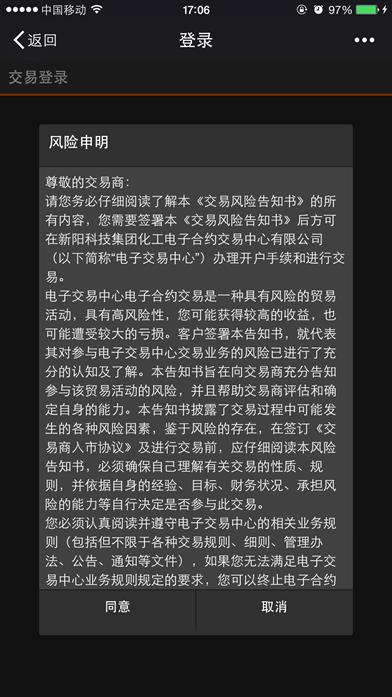 输入“账号”、“密码”点击【登录交易】按钮进入风险声明,如果不同意则点击【取消】按钮,如果同意则点击【同意】按钮,进入下单界面。