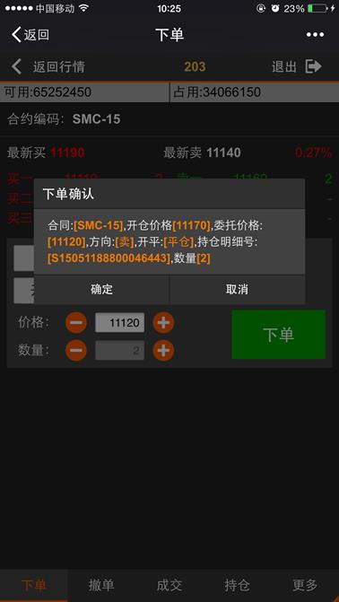选择买卖方向并输入“价格”和“数量”后点击【下单】按钮,下图所示弹出下单确认对话框,点击【确定】按钮则直接下单,点击【取消】按钮则取消该下单操作。