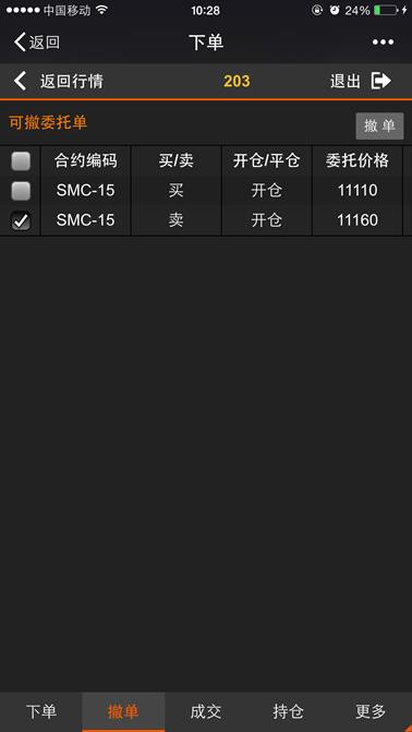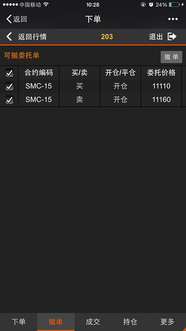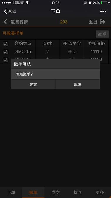 撤单页面显示当日下单成功后没有成交的委托单记录,这些记录可进行“撤单”操作,下图所示,在对应的可撤委托单列表的复选框中勾选需要撤单的委托单点击【撤单】按钮。或者在可撤委托单列表最顶上的复选框中勾选后点击【撤单】按钮则撤掉所有委托单,并弹出确认弹出框,点击【确定】或【取消】按钮返回撤单成功或失败的提示,页面支持左右移动来查看信息,点击【返回】按钮则返回行情列表,点击【退出】则退出登录。
