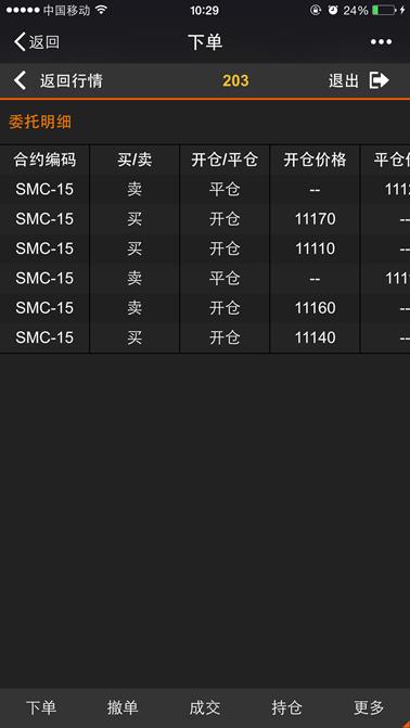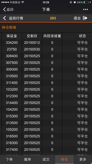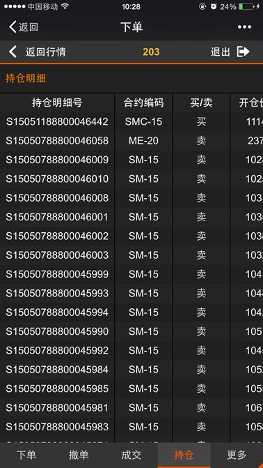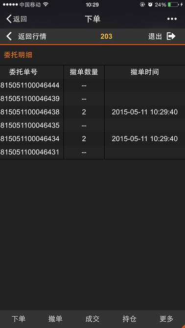 委托页面显示当日所有的委托记录,下图所示,页面支持左右、上下移动来查看持仓信息,点击【返回行情】按钮则返回到行情列表,点击【退出】按钮则退出登录。