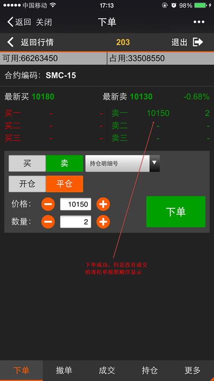 如果下单成功后没有成交则该笔委托单按照价格顺序显示在下单界面,下图所示。
