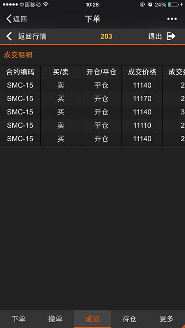 成交页面显示当日下单成功的成交明细记录,下图所示,页面支持左右、上下移动来查看成交信息,点击【返回行情】按钮则返回到行情列表界面,点击【退出】则退出登录。