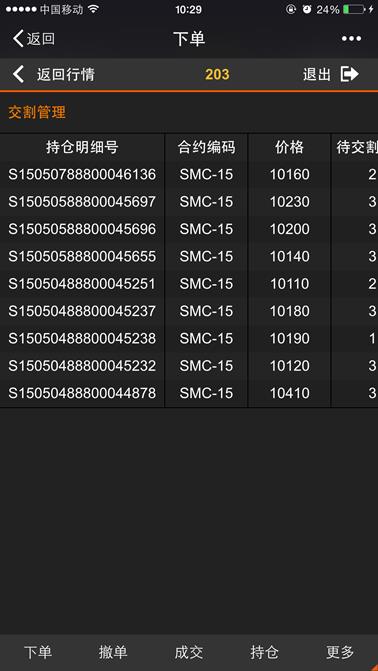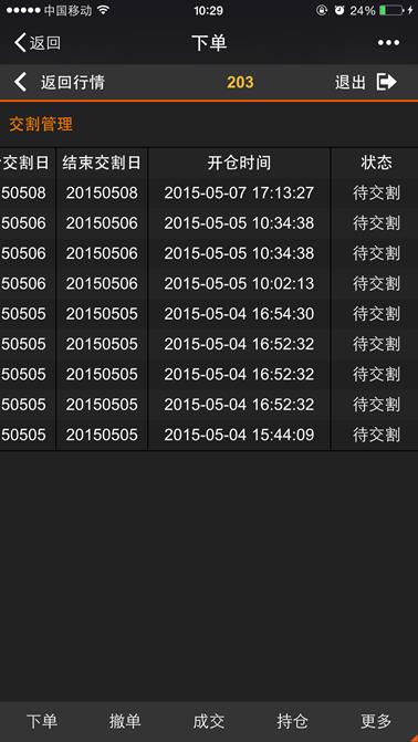 交割页面显示所有已进入交割期的持仓明细记录,下图所示,页面支持左右、上下移动来查看交割持仓信息,点击【返回行情】按钮则返回到行情列表,点击【退出】按钮则退出登录。