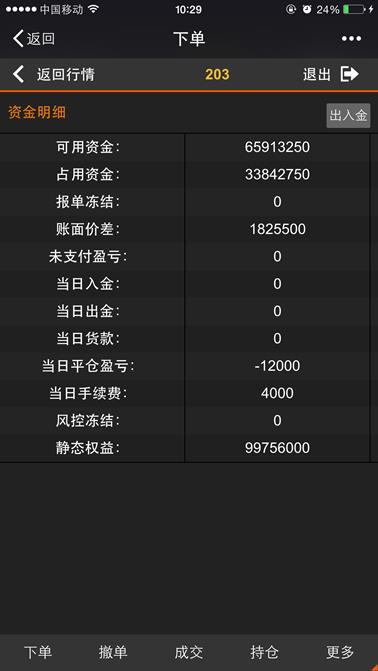 资金页面显示当前资金的使用明细信息,包括“可用资金”、“占用资金”、“报单冻结”、“账面价差”、“未支付盈亏”、“当日出金”、“当日入金”、“当如货款”、“当日平仓盈亏”、“当日手续费”、“风控冻结”、“静态权益”等,如下图所示,点击【返回行情】按钮则返回到行情列表,点击【退出】则退出登录。点击【出入金】按钮,填写“客户名称”、“支付金额”和“支付密码”,弹出“出入金确认”弹出框,点击【确定】或【取消】按钮进行出入金或撤销此操作。